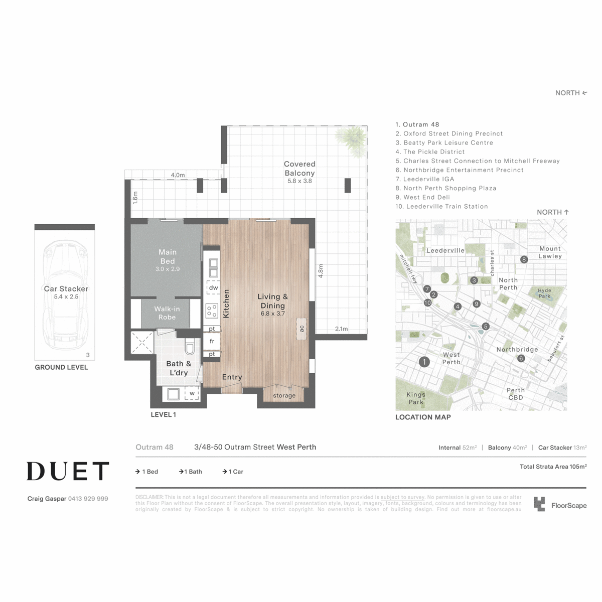 Council Rates: $1,269.85 per annum Water Rates: $1,345.35 per annum Strata Rates: $1,463.70 per quarter Strata Area: 105m2 (52m2 apartment, 40m2 balcony, 13m2 car stacker)