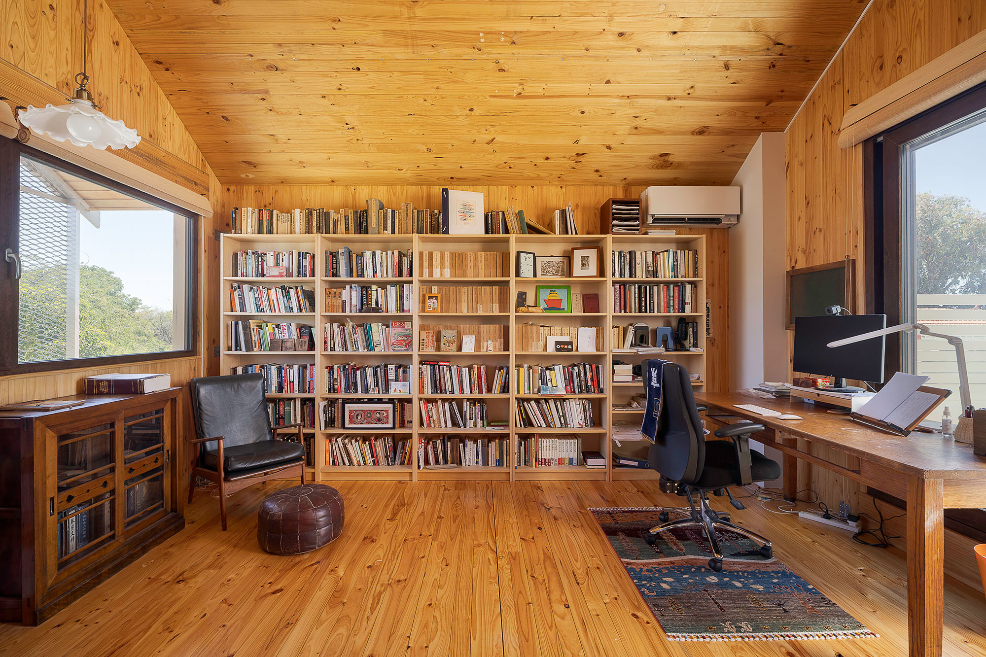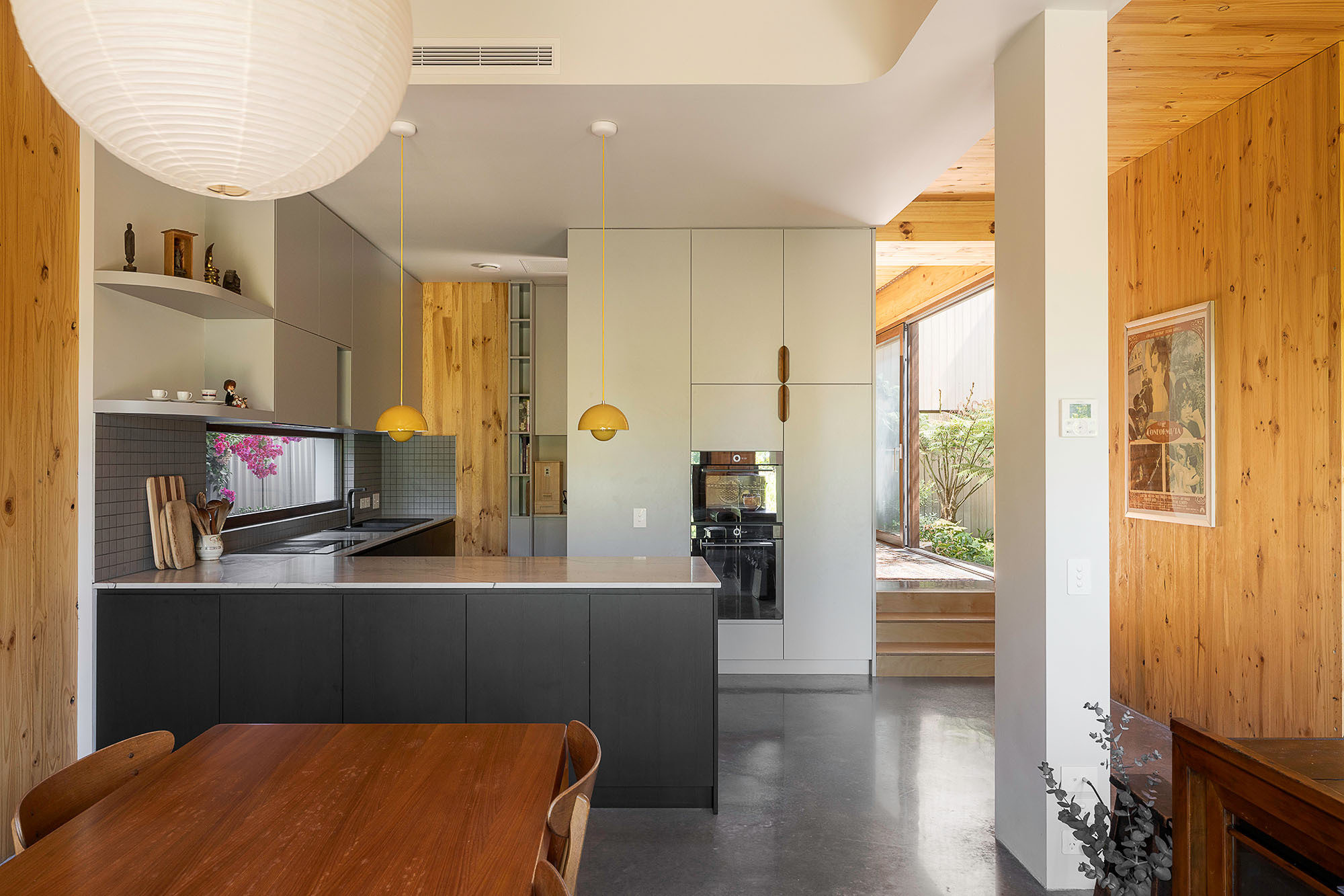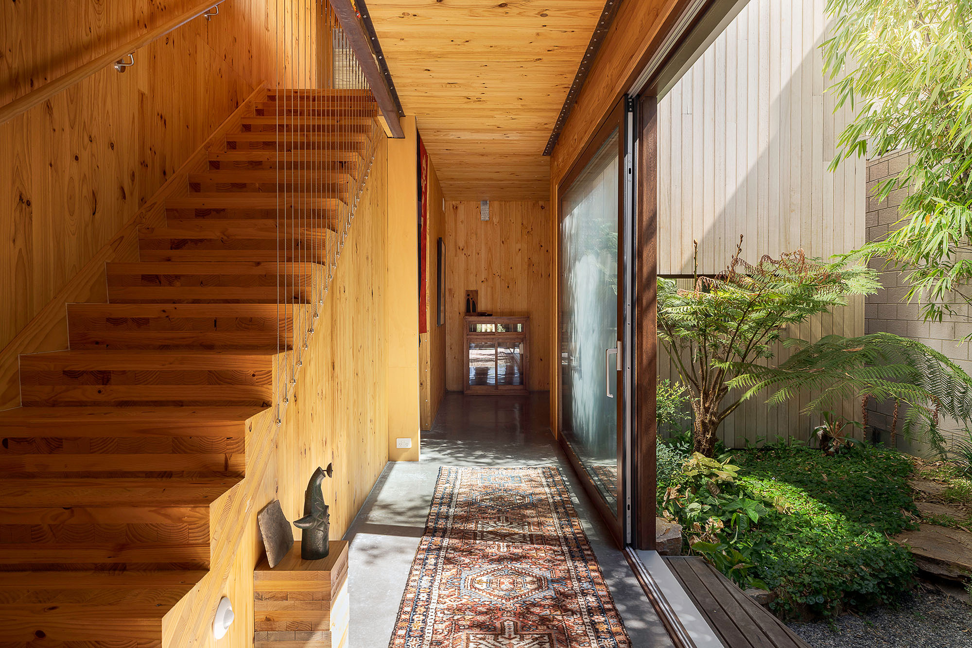 From here, the living spaces open up with ease. Natural light filters through full-height triple-glazed windows, while the warmth of cross-laminated timber wraps every surface, creating an atmosphere that feels both elevated and incredibly liveable. At the centre of the home, a bamboo-lined internal courtyard draws light deep into the floorplan, creating a quiet focal point that shifts beautifully throughout the day.