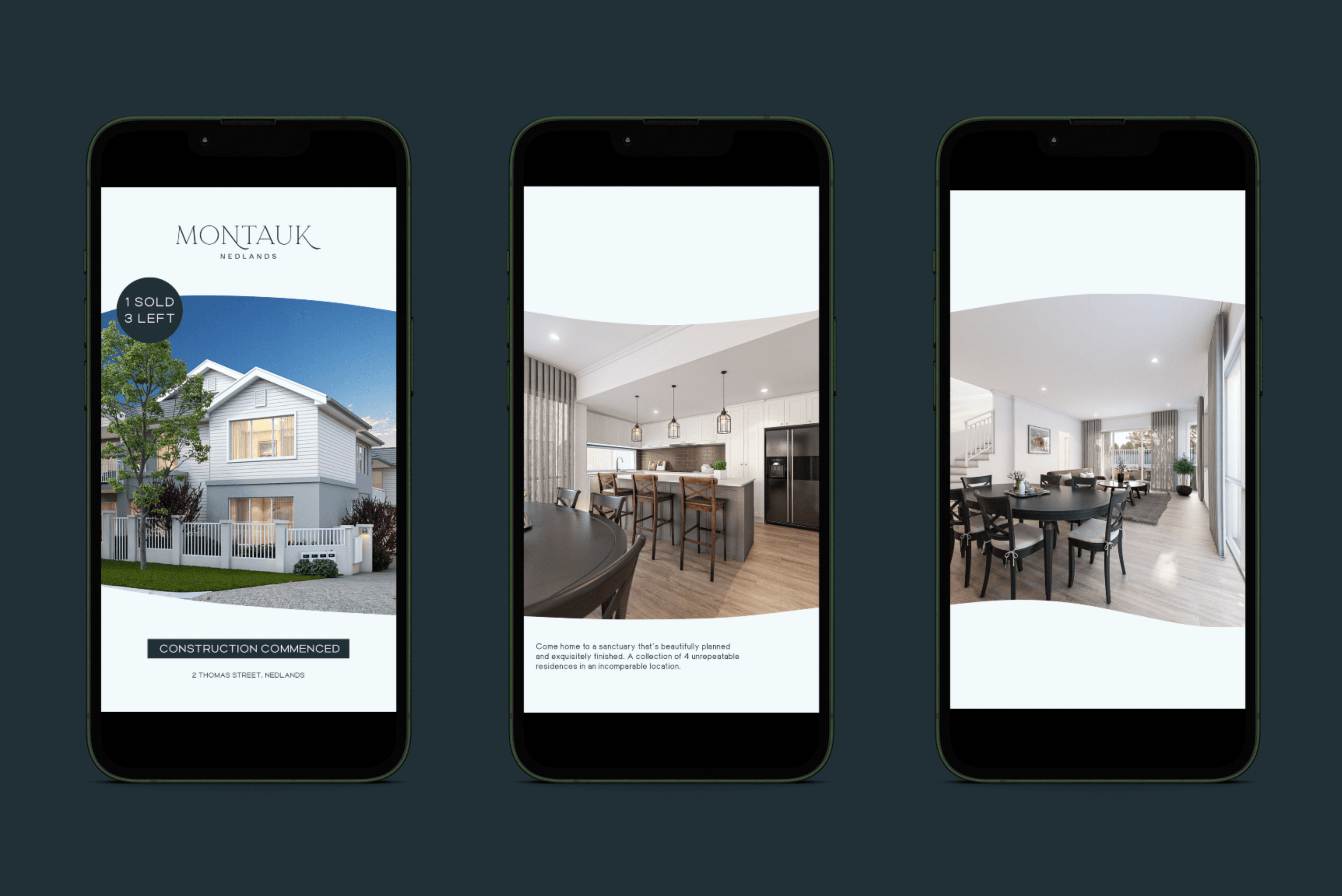 Montauk was intricately designed to capture Nedlands' tranquil lifestyle and its intimate connection to the river. Inspired by the sophisticated yet contemporary homes it symbolises, the Montauk brand echoes this through its fresh colour palette, graceful use of curves and elegant logo. Each element of the Montauk brand celebrates a life where modern sophistication and leisurely riverside comfort harmoniously intertwine.