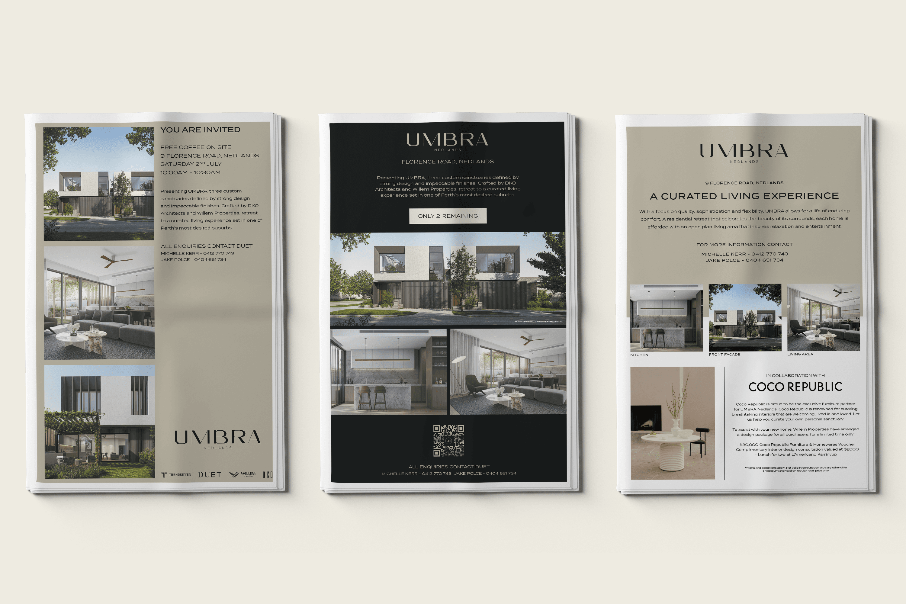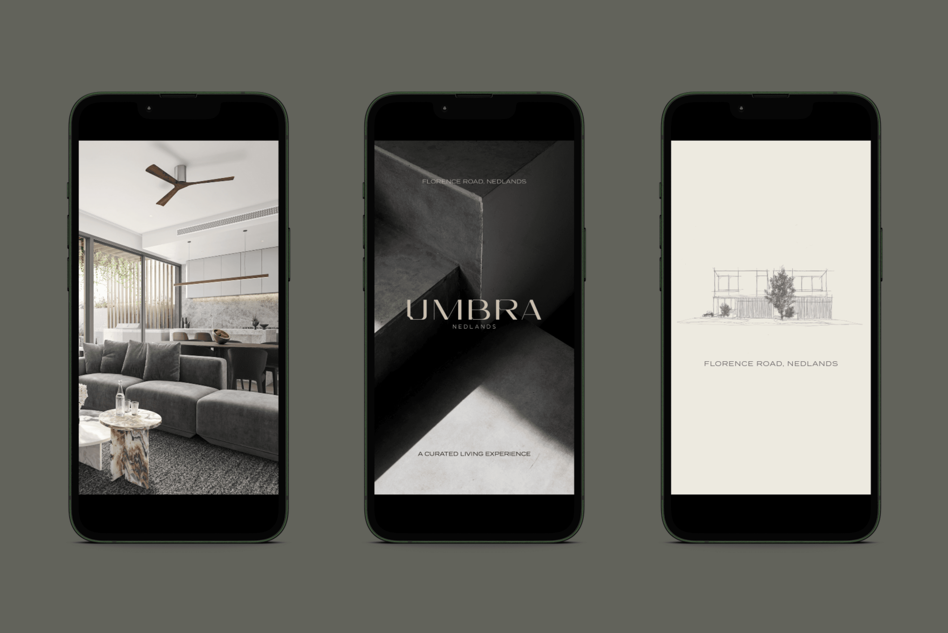 Umbra is a brand centered on exploring, constructing and breaking the boundaries of design. We sought to develop a brand that captures the projects’ distinctive design and contemporary form. Paying homage to the building's distinctive architecture, 'Umbra', meaning 'shadow', aptly references the structure's harmonious balance between light and dark. Formed by the distinctive and rich colours of the natural landscape, where each hue has its own mood, identity and tone, Umbra allows for a life of enduring comfort.